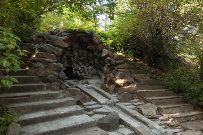 A spring in a cave is a natural output of groundwater, and it gives rise to a brook flowing into a pool named Black Sea and further on to Karl Marx Street.